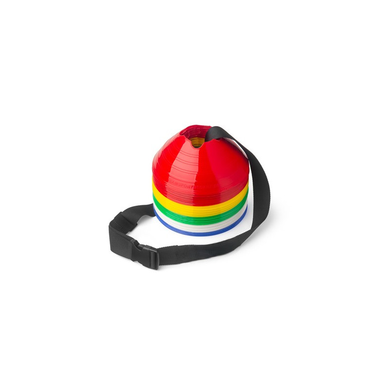 T-Pro mini konusu komplekts 50 gab., 5 krāsās. Šos pilonus var izmantot, atzīmējot laukumus vai trases gan uz zāles, gan uz sintētiskā zāliena vai sporta hallē.